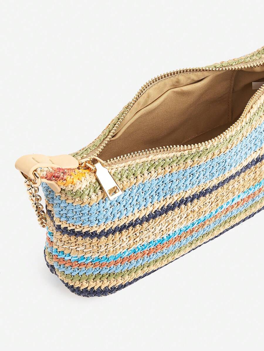 Women's Bohemian Style Braided Baguette Shoulder Bag With Thin Chain Strap Casual Vacation Shopping Fashion Daily Outfit Crossbody Purse